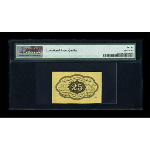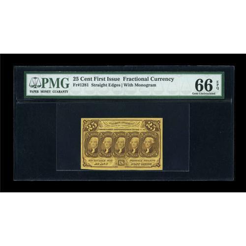 <B>Fr. 1281 25c First Issue PMG Gem Uncirculated 66 EPQ.</B></I> Near perfect front to back centering is visible on this near-Superb issue. The paper is bright and original.<BR><BR><b>Shipping:</b> Coins & Currency (<a target="_blank" href="http://www.heritageauctions.com/common/shipping.php">view shipping information</a>)