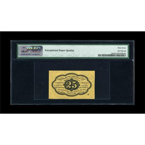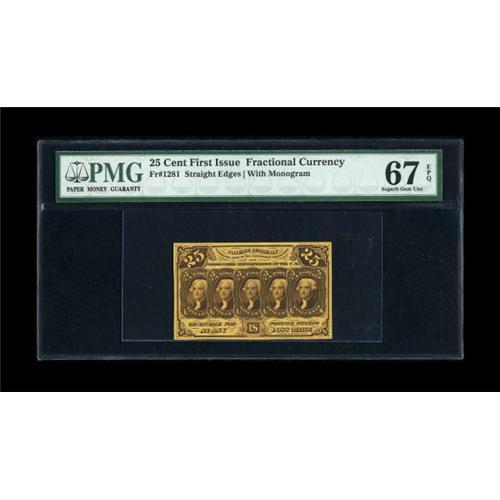 <B>Fr. 1281 25c First Issue PMG Superb Gem Unc 67 EPQ.</B></I> This is a common note in an uncommon grade. Even margins, excellent centering and deep ink color highlight this example.<BR><BR><b>Shipping:</b> Coins & Currency (<a target="_blank" href="http://www.heritageauctions.com/common/shipping.php">view shipping information</a>)