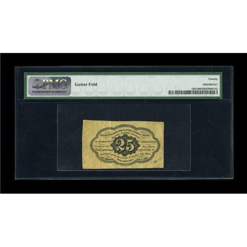 <B>Fr. 1281 25¢ First Issue PMG Very Fine 20.</B></I> The PMG comment "Gutter Fold" is denoted on the back of the holder. This is a very nice example with the aforementioned prominent gutter fold error in plain view across the better part of the upper right portion of the note. Errors such as this have been realizing many hundreds of dollars and we would expect the same from this delightful prize.<BR><BR><b>Shipping:</b> Coins & Currency (<a target="_blank" href="http://www.heritageauctions.com/common/shipping.php">view shipping information</a>)