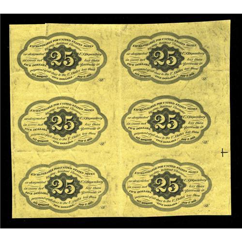 <B>Fr. 1281 25c First Issue Uncut Block Of Six About New.</B></I> A vertical fold between the notes and a pre-printing crinkle in the top two right-hand notes are observed on this lovely block of six. It also carries a nice amount of selvedge along the left-hand edge.