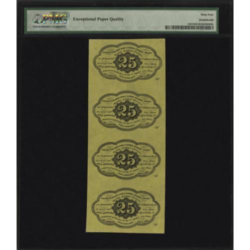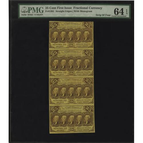 <B>Fr. 1281 25c First Issue Vertical Strip of Four PMG Choice Uncirculated 64 EPQ.</B></I> This quality four note strip has avoided the telltale signs of handling. <BR><BR><b>Shipping:</b> Coins & Currency (<a target="_blank" href="http://www.heritageauctions.com/common/shipping.php">view shipping information</a>)