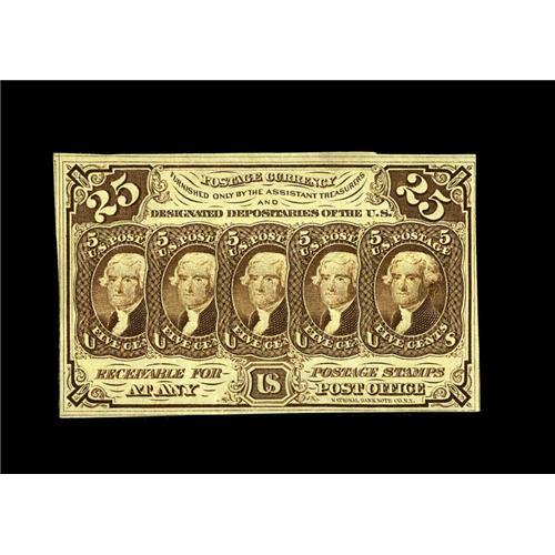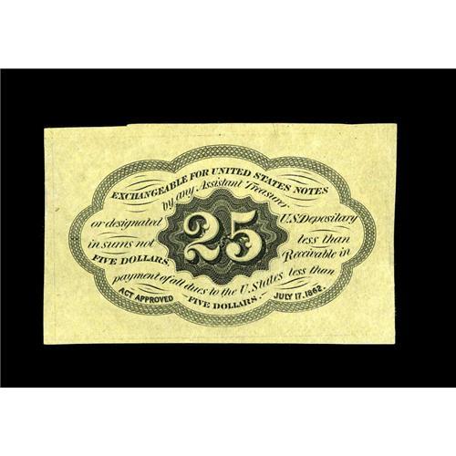 <B>Fr. 1282 25¢ First Issue Very Choice New.</B></I> Irregularly margined, but clear of the frame line at all points. Bright and very scarce.<BR><BR><b>Shipping:</b> Coins & Currency (<a target="_blank" href="http://www.heritageauctions.com/common/shipping.php">view shipping information</a>)