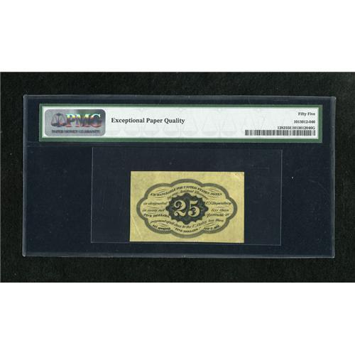 <B>Fr. 1282 25c First Issue PMG About Uncirculated 55 EPQ.</B></I> Lightly folded and bumped corners are the only circulation this no monogram piece has seen. This is a variety that is typically very difficult to find in nice New condition so an attractive About New is well within the reach of aspiring collectors.<BR><BR><b>Shipping:</b> Coins & Currency (<a target="_blank" href="http://www.heritageauctions.com/common/shipping.php">view shipping information</a>)