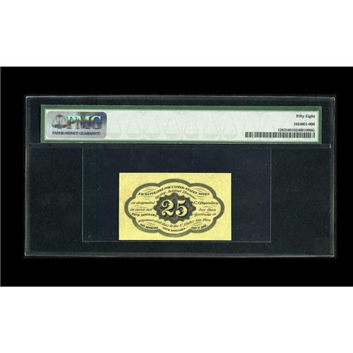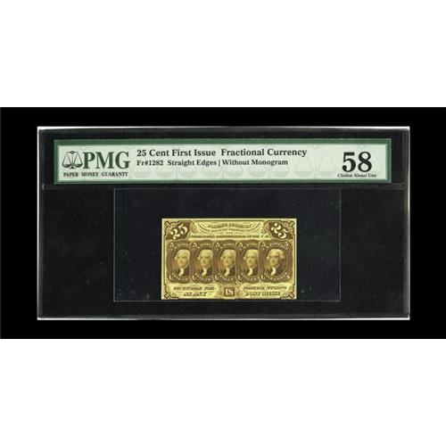 <B>Fr. 1282 25c First Issue PMG Choice About Unc 58.</B></I> This is a very high grade example of this much scarcer straight edge no monogram variety that is printed on the typical bright yellow paper with excellent eye appeal and attractive paper surfaces. There is no real evidence of circulation as seen through the holder so we would expect closer to Choice CU money to be realized here.