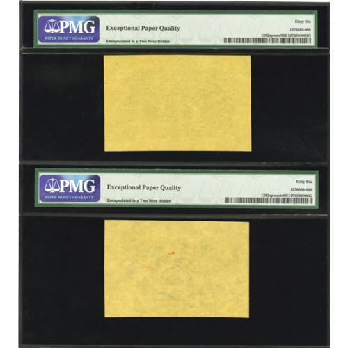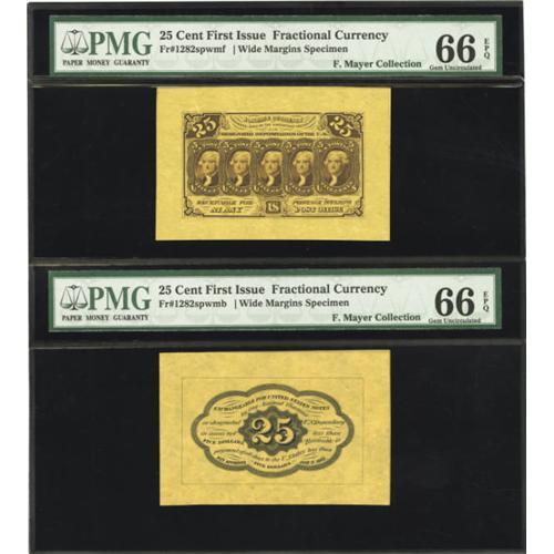 <B>Fr. 1282SP 25¢ First Issue Wide Margin Pair PMG Gem Uncirculated 66 EPQ.</B></I> Both halves of this magnificent pair are fully wide, perfectly bright and as pretty as they can be. They match very nicely for both color and surface characteristics and show cutting guides most of the way around. An exceptional pair in outstanding condition. Pre-third-party grading testament to the pair's quality is the fact that Frederick Mayer pair over $1000 for these on a $400 estimate in 2000. This was formerly from the Matt Rothert sale, and the flip from that sale is present. (2 notes)(2250-up)<BR><I>CAA January 2000 Mike Marchioni Collection Lot 65; previously Bowers & Ruddy Matt Rothert Collection November 17, 1973 Lot 1313.</B></I><BR><I>From The Frederick Mayer Collection</B></I><BR><BR><b>Shipping:</b> Coins & Currency (<a target="_blank" href="http://www.heritageauctions.com/common/shipping.php">view shipping information</a>)
