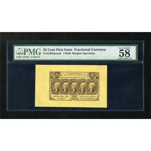 <B>Fr. 1282SP Wide Margin Face 25c First Issue PMG Choice About Unc 58.</B></I> The left side is very large on this note which has been hinged on the back.<BR><BR><b>Shipping:</b> Coins & Currency (<a target="_blank" href="http://www.heritageauctions.com/common/shipping.php">view shipping information</a>)