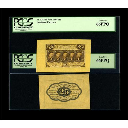 <B>Fr. 1282SP 25¢ First Issue Wide Margin Pair PCGS Gem New 66PPQ.</B></I> Both the face and the back grade the same on this gorgeous, fully wide pair. The back half is so wide that three full frame lines, and part of the fourth, are visible at its outer edges. Wide Margin Specimens have been extremely popular in the past year, and we are very pleased to be able to offer this extremely high quality pair.<BR><BR><b>Shipping:</b> Coins & Currency (<a target="_blank" href="http://www.heritageauctions.com/common/shipping.php">view shipping information</a>)