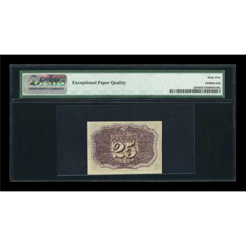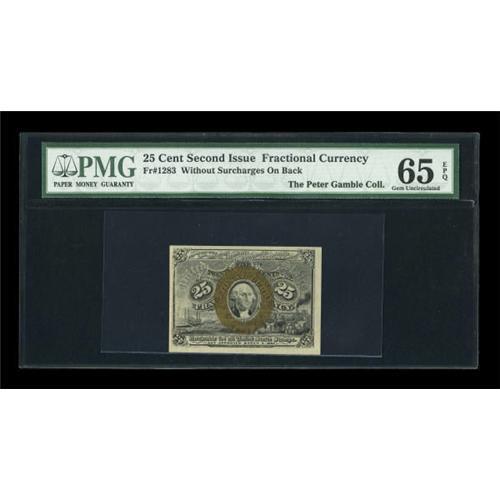 <B>Fr. 1283 25¢ Second Issue PMG Gem Uncirculated 65 EPQ.</B></I> The back centering is just about perfect on this attractive Second Issue 25¢ note. The face is a bit centered toward the upper left, but the margins are large enough all around to more-than-support the 65 grade level. <BR><I>From The Peter Gamble Collection.</B></I><BR><BR><b>Shipping:</b> Coins & Currency (<a target="_blank" href="http://www.heritageauctions.com/common/shipping.php">view shipping information</a>)
