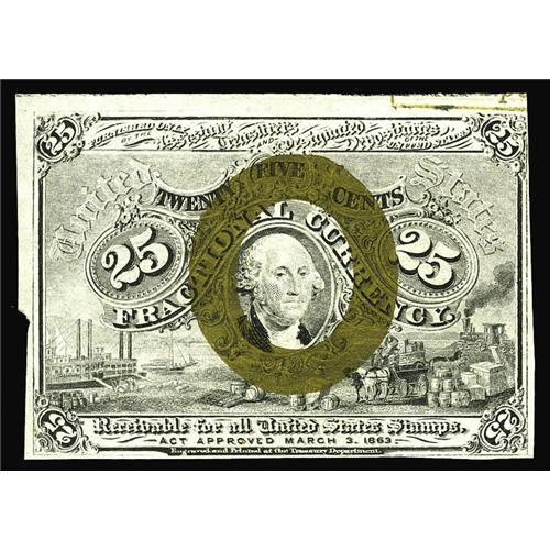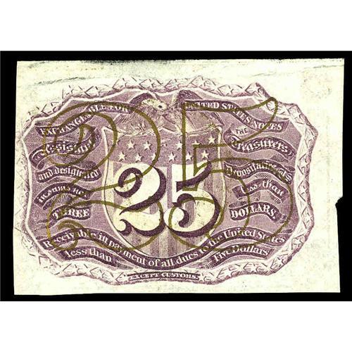 <B>Fr. 1283 25c Second Issue Choice New.</B></I> The margins vary in size, though the most important margin at top was not trimmed so far as to get rid of the partial Treasury Rectangle. There are two versions about why the stamp, "Treas Dpt." was designed and implemented. The first is the rectangle was stamped on the corner of the sheet to indicate that it had been counted. The other argument is that Congress mandated new paper to circumvent counterfeiting, but this requirement was presumably met by denoting each sheet with the stamp.