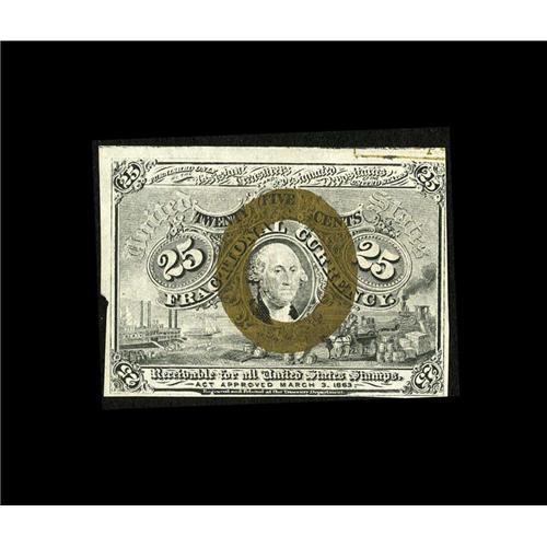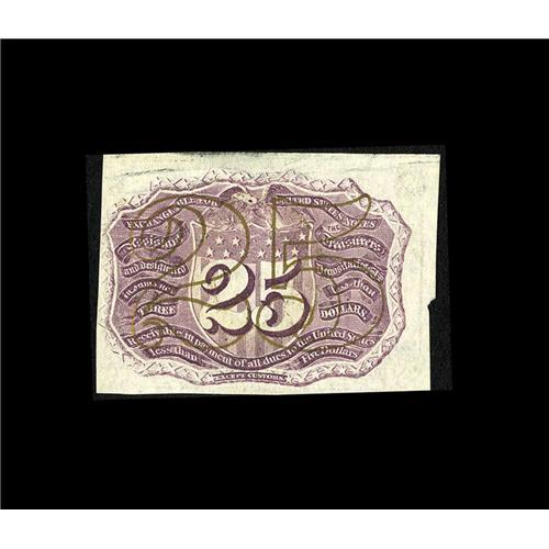 <B>Fr. 1283 25c Second Issue Choice New.</B></I> The margins vary in size, though the most important margin at top was not trimmed so far as to get rid of the partial Treasury Rectangle. There are two versions about why the stamp, "Treas Dpt." was designed and implemented. The first is the rectangle was stamped on the corner of the sheet to indicate that it had been counted. The other argument is that Congress mandated new paper to circumvent counterfeiting, but this requirement was presumably met by denoting each sheet with the stamp.<BR><BR><b>Shipping:</b> Coin/Currency (<a target="_blank" href="http://www.heritageauctions.com/common/shipping.php">view shipping information</a>)