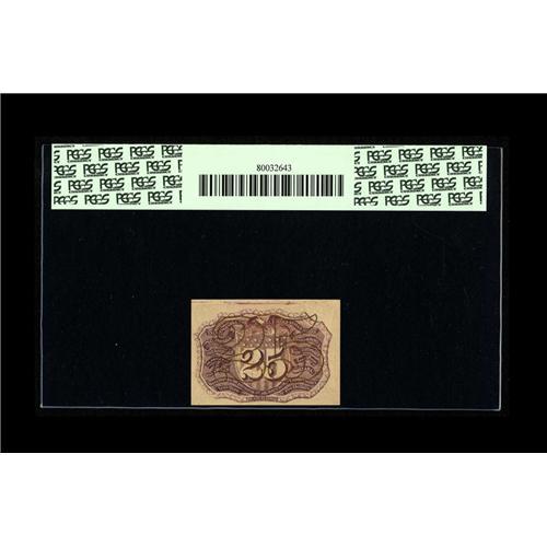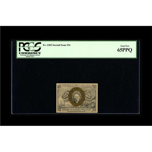 <B>Fr. 1283 25c Second Issue PCGS Gem New 65PPQ.</B></I> A reflective bronze overprint adorns this note.