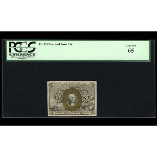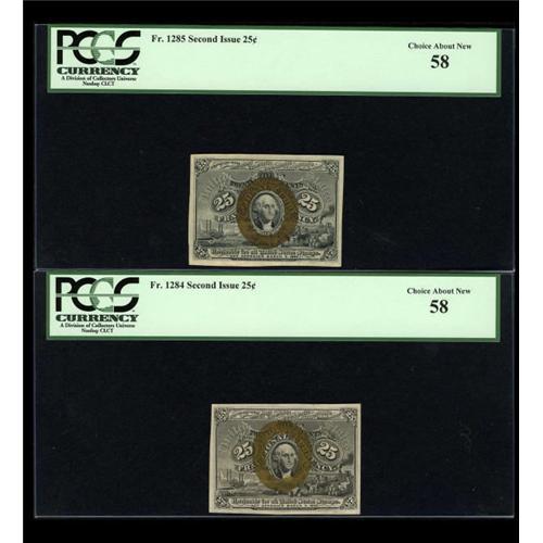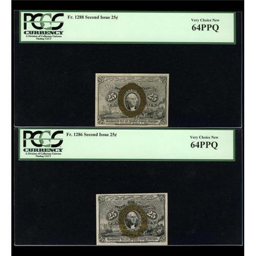 <B>Five Different Second Issue 25c Notes.</B></I> <B>Fr. 1283 PCGS Gem New</B></I> <B>65</B></I>, <B>Fr. 1284 </B></I>a very tough number <B>PCGS Choice About New 58</B></I>, <B>Fr. 1285 </B></I>with a nice, sharp "A" <B>PCGS Choice About New 58</B></I>, <B>Fr. 1286</B></I> with a clear, distinct "S" <B>PCGS Very Choice New 64PPQ </B></I>and <B>Fr. 1288 PCGS Very Choice New 64PPQ</B></I>.<BR><I>From The Thomas M. Flynn Collection</B></I><BR><BR><b>Shipping:</b> Coins & Currency (<a target="_blank" href="http://www.heritageauctions.com/common/shipping.php">view shipping information</a>)