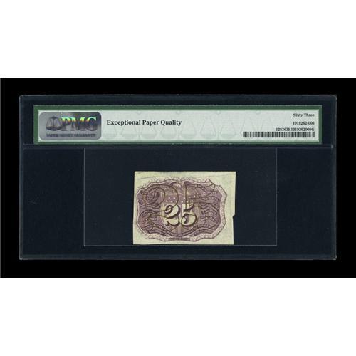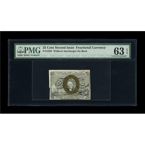 <B>Fr. 1283 25c Second Issue PMG Choice Uncirculated 63 EPQ</B></I> The margins vary in size, though the most important margin at top was not trimmed so far as to get rid of the partial Treasury Rectangle. There are two versions about why the stamp, "Treas Dpt." was designed and implemented. The first is the rectangle was stamped on the corner of the sheet to indicate that it had been counted. The other argument is that Congress mandated new paper to circumvent counterfeiting, but this requirement was presumably met by denoting each sheet with the stamp.<BR><BR><b>Shipping:</b> Coins & Currency (<a target="_blank" href="http://www.heritageauctions.com/common/shipping.php">view shipping information</a>)