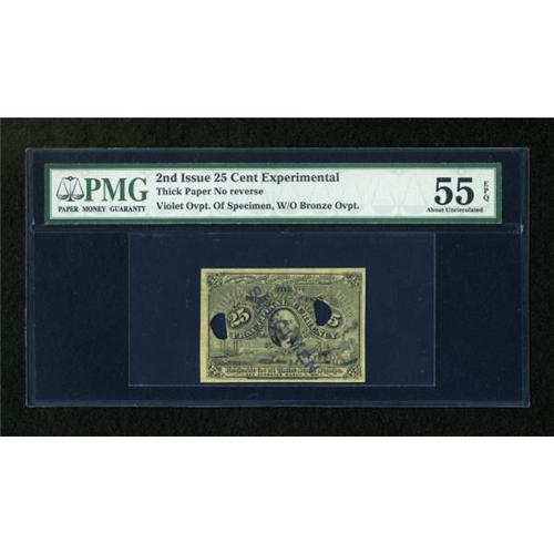 <B>Fr. 1283 25c Second Issue Experimental Face PMG About Uncirculated 55 EPQ.</B></I> An attractive experimental that does not include the bronze overprint. Similar to Milton 2E25F.3c.<BR><BR><b>Shipping:</b> Coins & Currency (<a target="_blank" href="http://www.heritageauctions.com/common/shipping.php">view shipping information</a>)