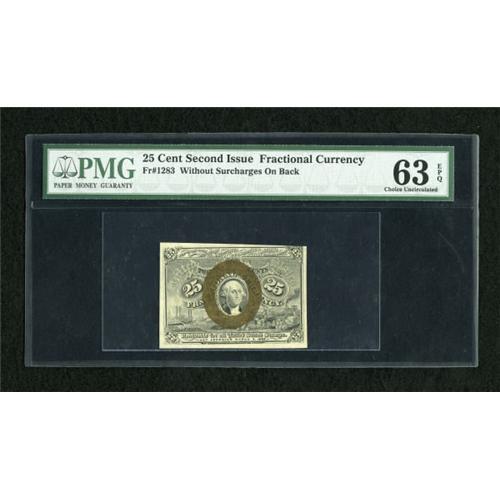 <B>Fr. 1283 25c Second Issue PMG Choice Uncirculated 63 EPQ.</B></I> The upper right trim and back centering keep this second issue type note from the gem grade.<BR><BR><b>Shipping:</b> Coins & Currency (<a target="_blank" href="http://www.heritageauctions.com/common/shipping.php">view shipping information</a>)