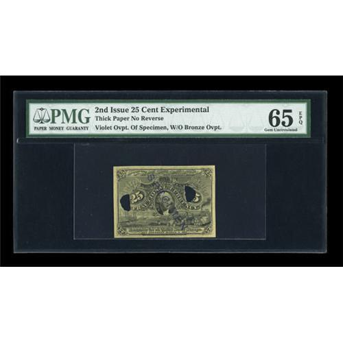 <B>Fr. 1283 25c Second Issue Experimental Face PMG Gem Uncirculated 65 EPQ.</B></I> The bold violet overprint adds to the appeal of this cancelled Experimental. Thick paper was used on this piece and according to PMG it is similar to Milton 2E25F.3c.<BR><BR><b>Shipping:</b> Coins & Currency (<a target="_blank" href="http://www.heritageauctions.com/common/shipping.php">view shipping information</a>)