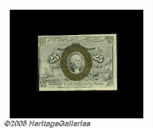 <B>Fr. 1283 Milton 2R25.1 25¢ Second Issue About New.</B></I> Typically margined and with a circular punch-out in the center of the note that has nearly, but not quite, fallen out.