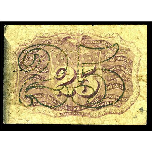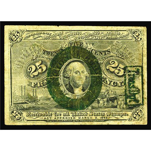 <B>Fr. 1283 Milton 2R25.1c 25¢ Second Issue Treasury Rectangle Very Fine.</B></I> The note is well circulated, and it has some holes on the "T" of "Treas" in the rectangle, but the entire box and every letter are clear. The bronze has darkened, which makes the rectangle much more distinct than on most examples. Treasury Department rectangles had been printed on the blank paper before the notes were printed, and were intended to be trimmed off. A full explanation of their history can be found in our January '97 Milt Friedberg catalog or our May '05 O'Mara catalog.