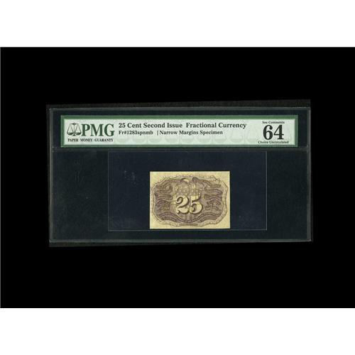 <B>Fr. 1283SP 25c Second Issue Narrow Margin Back Specimen PMG Choice Uncirculated 64 EPQ.</B></I> Exceptional paper quality is a trait of this specimen.