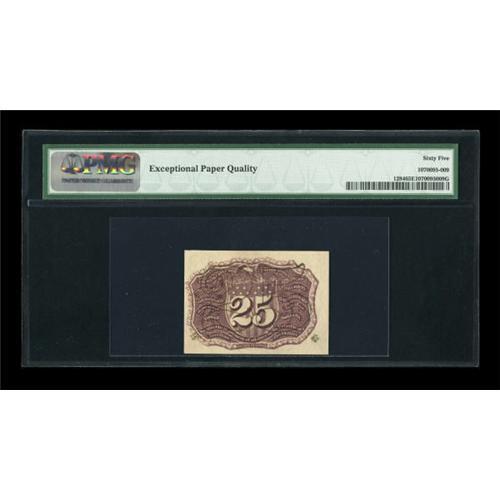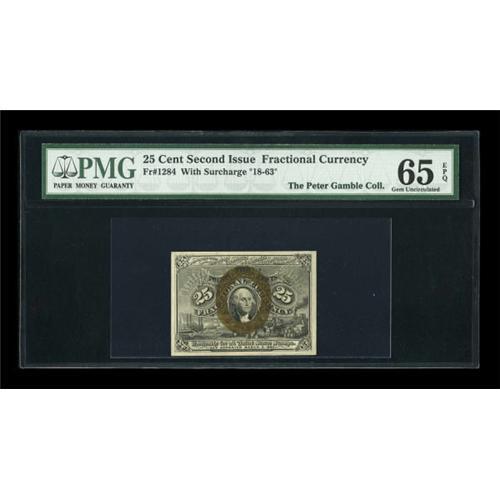 <B>Fr. 1284 25¢ Second Issue PMG Gem Uncirculated 65 EPQ.</B></I> This is a number that is very difficult to locate in high grade. In fact, of the 27 notes that PMG has graded as of the end of November, this is the sole 65 example with none graded higher. The margins are broad and even on the face and the back design is just a shade off to the left. Save for the back centering, this piece could have graded even higher. <BR><I>From The Peter Gamble Collection.</B></I><BR><BR><b>Shipping:</b> Coins & Currency (<a target="_blank" href="http://www.heritageauctions.com/common/shipping.php">view shipping information</a>)