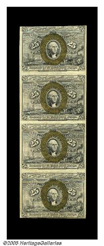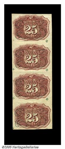 <B>Fr. 1284 25¢ Second Issue Vertical Strip of Four Extremely Fine.</B></I> The bronze has become a bit subdued on this Second Issue multiple.