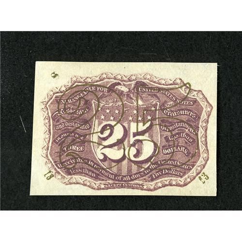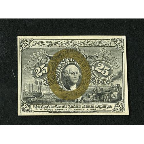 <B>Fr. 1286 25c Second Issue Gem New.</B></I> Even though the side margins bow inward towards the top all of the other technical merits of this scarcer note are indicative of the gem grade. Bright bronzing, majestic ink colors, and crystal clear surcharges all lend credence to the grade.<BR><BR><b>Shipping:</b> Coins & Currency (<a target="_blank" href="http://www.heritageauctions.com/common/shipping.php">view shipping information</a>)