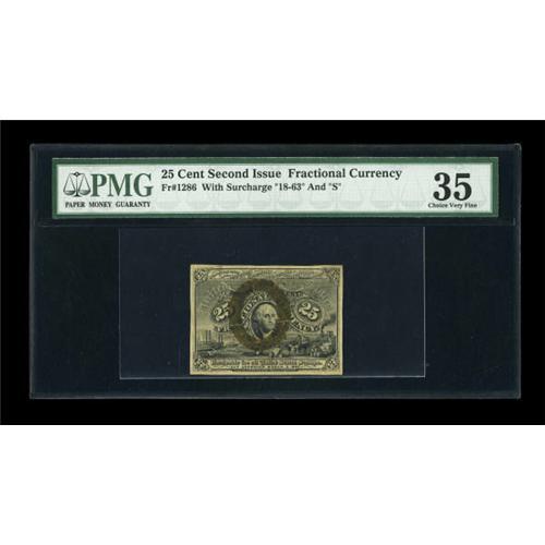 <B>Fr. 1286 25c Second Issue Inverted "S" PMG Choice Very Fine 35.</B></I> This is one of about a dozen examples known. This Inverted "S" is a new piece to the short census for this type. The "S" unfortunately is not particularly clear, but it is clear enough for those who have studied these varieties for years. This rare variety is listed on the third-party holder.<BR><BR><b>Shipping:</b> Coins & Currency (<a target="_blank" href="http://www.heritageauctions.com/common/shipping.php">view shipping information</a>)