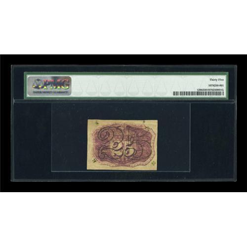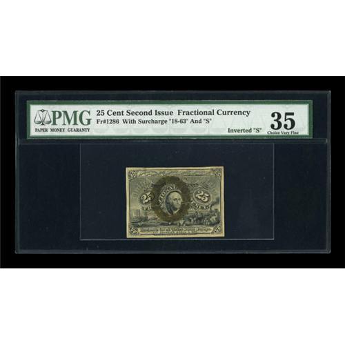 <B>Fr. 1286 25c Second Issue Inverted "S" PMG Choice Very Fine 35.</B></I> This is one of about a dozen examples known. This Inverted "S" is a new piece to the short census for this type. The "S" unfortunately is not particularly clear, but it is clear enough for those who have studied these varieties for years. This rare variety is listed on the third-party holder.<BR><BR><b>Shipping:</b> Coins & Currency (<a target="_blank" href="http://www.heritageauctions.com/common/shipping.php">view shipping information</a>)