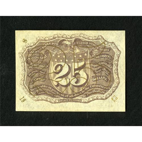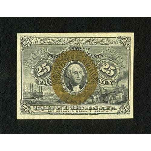 <B>Fr. 1286 25c Second Issue Choice New.</B></I> The bronze oval is reflective and the surcharges are distinct on this note. Also, all of the margins are at least 1mm wide. A couple of pinholes are noticed, too.<BR><BR><b>Shipping:</b> Coins & Currency (<a target="_blank" href="http://www.heritageauctions.com/common/shipping.php">view shipping information</a>)