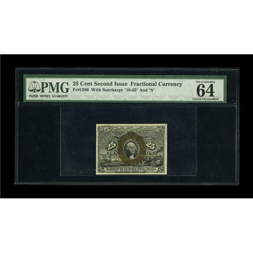<B>Fr. 1286 25c Second Issue PMG Choice Uncirculated 64 EPQ.</B></I> Bright bronzing, excellent color and superb margins are found on this lovely example of a much scarcer number. We would not be at all surprised to see this land in a higher number holder some day.<BR><BR><b>Shipping:</b> Coins & Currency (<a target="_blank" href="http://www.heritageauctions.com/common/shipping.php">view shipping information</a>)