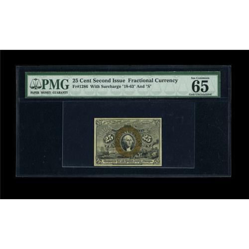 <B>Fr. 1286 25c Second Issue PMG Gem Uncirculated 65 EPQ.</B></I> Broadly margined, bright, and attractive. Unlike most pieces of this type, the "S" in the surcharge is clean and sharp<BR><BR><b>Shipping:</b> Coins & Currency (<a target="_blank" href="http://www.heritageauctions.com/common/shipping.php">view shipping information</a>)