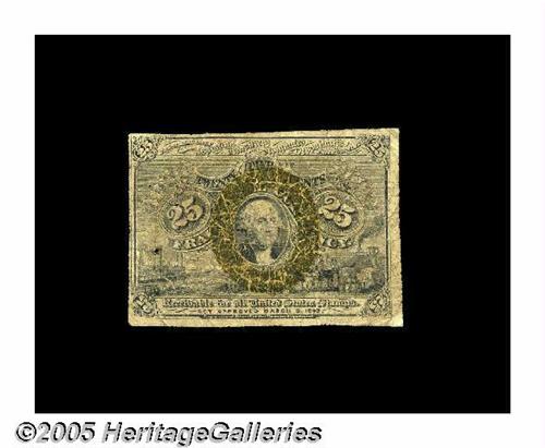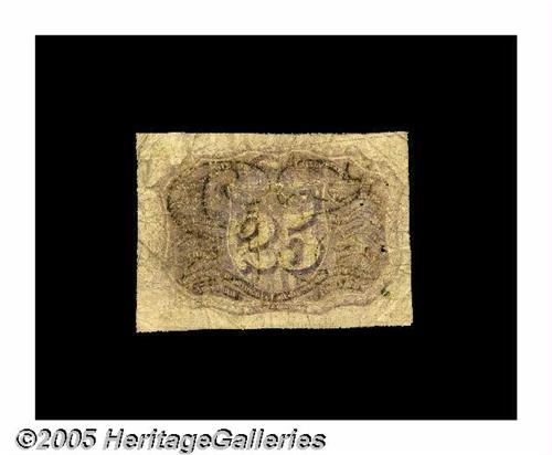 <B>Fr. 1286 Milton 2R25.3f 25¢ Second Issue Inverted Back Surcharge Good.</B></I> A rather low-grade example of this rare invert. Only five pieces are known to exist. It's solid around the edges, and other than heavy wear, its only problem is a group of pinholes, two of which are rather large.