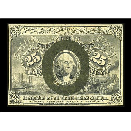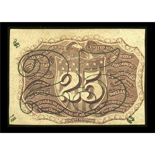<B>Fr. 1286 Milton 2R25.3g 25¢ Second Issue Inverted "S" Choice About New.</B></I> From our sale of the Tom O'Mara Collection, where it was described, "Much more rare as a regular issue note than as an experimental. There are about seven or eight pieces known, but on most, the inverted "S" can barely be discerned. On this note, it is razor-sharp and utterly unmistakable. It was acquired by Tom when he purchased the Doug Hales Collection, and Doug had bought it years earlier from Ossie."