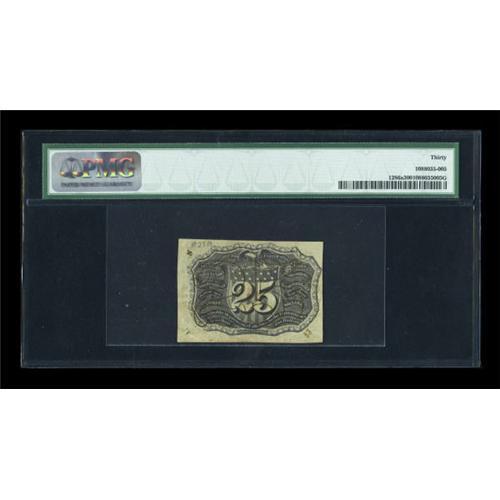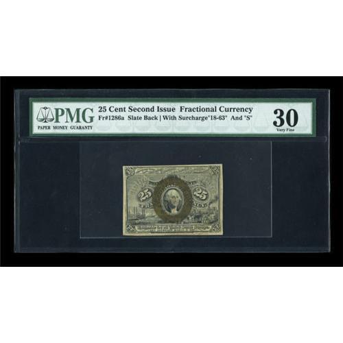<B>Fr. 1286a 25c Slate Back Second Issue PMG Very Fine 30.</B></I> This is a wonderful example of this interesting slate back variety which does not have so much as a hint of purple. The back surcharges are razor sharp and well defined with three broad margins, and a tight top margin which is clear of the frame line. Notes such as this usually do very well because they are difficult to come by and draw a lot of attention. Kravitz states that there are less than thirty known. <BR><BR><b>Shipping:</b> Coins & Currency (<a target="_blank" href="http://www.heritageauctions.com/common/shipping.php">view shipping information</a>)