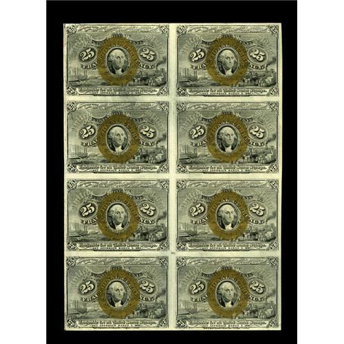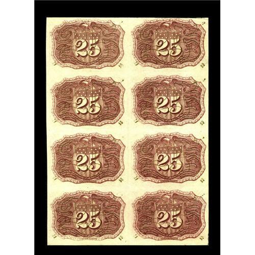 <B>Fr. 1288 25c Second Issue Block of Eight Choice New.</B></I> This is a high-grade block of a Friedberg number that we have not had a multiple on in years. The top left note shows a little handling and there is a fold down the center gutter, otherwise this block is <B>Choice New.</B></I> The bronze ovals are neatly centered and the back carries an especially dark shade of ink. A few of the surcharges are a little bit indistinct, but this is still a most attractive block.<BR><BR><b>Shipping:</b> Coin/Currency (<a target="_blank" href="http://www.heritageauctions.com/common/shipping.php">view shipping information</a>)