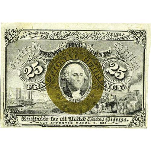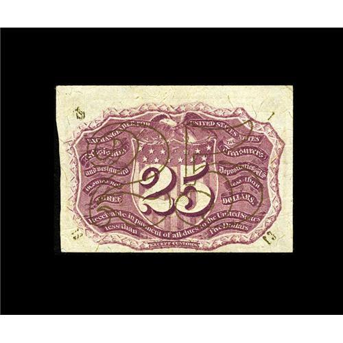 <B>Fr. 1289 25c Second Issue Extremely Fine.</B></I> Light handling and a perfectly centered bronze oval highlight this scarce fiber paper note that has a tiny face and back split in the upper left-hand corner. The consignor informs us that this is a scarce pink reverse variety. We'll let the bidders decide.