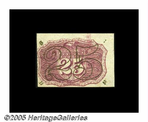 <B>Fr. 1289 Milton 2R25.8 25¢ Second Issue Choice New.</B></I> But for its centering, this Fiber Paper 25¢ note has all the attributes of a real Gem. The note has two unrelated offsets, a partial offset of the large bronze "25" on the back to the face, and strangely, a small but clear offset of the seal of a Large Size note on the back.