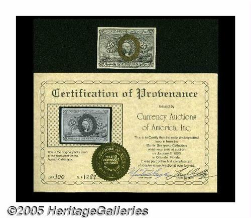 <B>Fr. 1289 Milton 2R25.8a 25¢ Second Issue Superb Gem New.</B></I> One of the very nicest Second Issue Fiber Paper Notes of any number that we have seen or handled. The margins are jumbo and even all the way around on both sides; the paper, ink and bronze are all perfectly bright and the printing has a sharpness and clarity that is unusual for even a regular-paper issue, let alone a fiber-paper note. As close to a technically perfect example as we've ever seen for a Second Issue Fiber Paper Fractional, this is a dead ringer to (although not the same piece as) the Scheuermann example which we sold in January of 2001 for $2,475.This piece is ex-Gengerke Lot 100 (certificate included with lot), which realized $2,310 in 1995. In the current Fractional market, which has begun to appreciate condition rarity, this piece could easily double that figure.