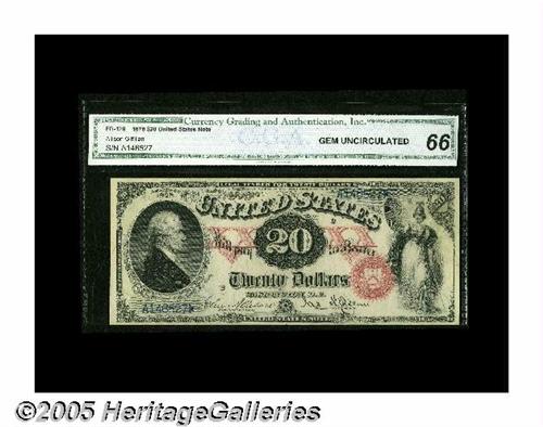<B>Fr. 129 $20 1878 Legal Tender CGA Gem Uncirculated 66.</B></I> A very pretty example of a type that does come rather nice. Unlike most of this number, this one is not printed on the paper with the bold repetitive USUSUS watermark nor does it have the heavy blue anti-counterfeiting stain. This one features the paper with a heavy profusion of blue fibers at the right end of the back as its active anti-counterfeiting device.