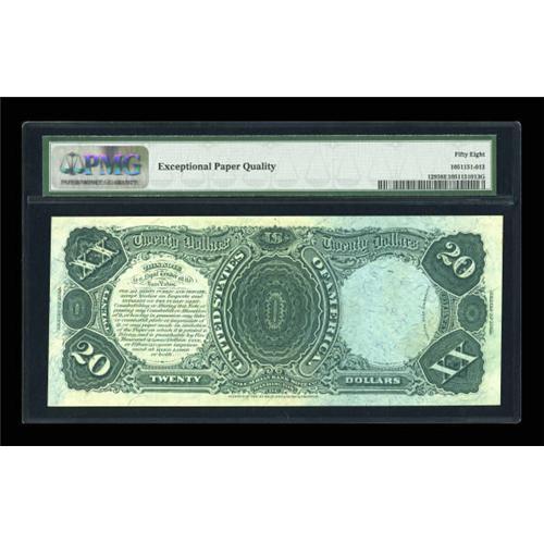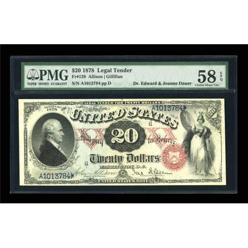 <B>Fr. 129 $20 1878 Legal Tender PMG Choice About Unc 58 EPQ.</B></I> The margins and colors are the stand-out features of this Gem-appearing, About Uncirculated example. From the standpoint of eye appeal alone, this piece blows away the often seen Gems of this number. A light corner fold at the lower right which barely enters the design accounts for the grade, but this beautiful note should be valued far in excess of typical AU examples. It is pictured at the top of page 98 in the Dauers' 2003 reference work <I>American History As Seen Through Currency</B></I>. <BR><I>From The Dr. Edward & Joanne Dauer Collection</B></I><BR><BR><b>Shipping:</b> Coins & Currency (<a target="_blank" href="http://www.heritageauctions.com/common/shipping.php">view shipping information</a>)