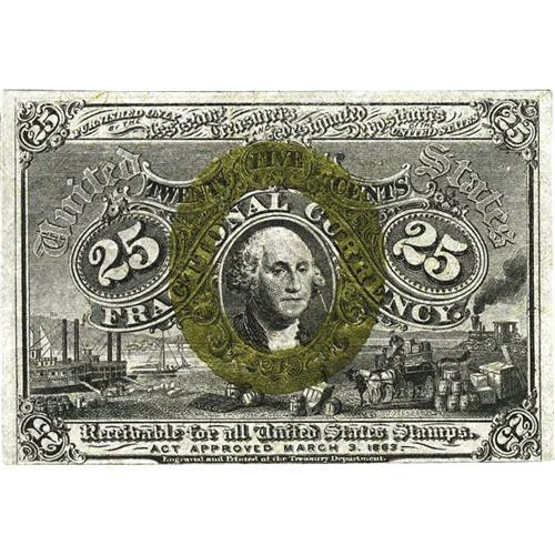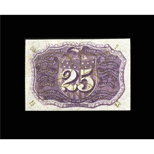 <B>Fr. 1290 25c Second Issue Very Choice New.</B></I> This rare Fiber Paper note is an absolute Gem but for its centering. The bottom face margin is tight all the way across. The other three face margins are broad and even, and the brightly colored purple back is ideally centered. This is a scarce note in all grades, and even with its one tight margin, this note is in the top ten for quality. A very pretty example of a scarce Fiber Paper number.