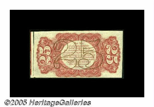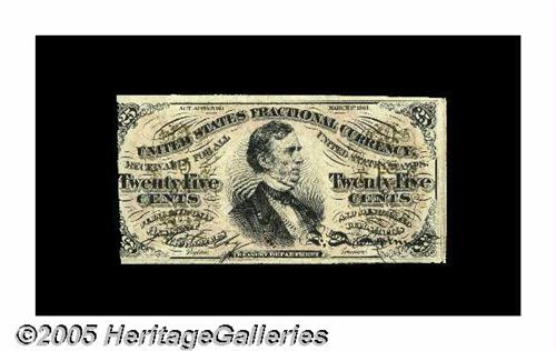<B>Fr. 1291 25¢ Third Issue Choice New.</B></I> A nicely original red back Fessenden which would have qualified for a higher grade but for the fact that the face centering is off toward the left so that the trim cuts slightly into the design. Ex-Lyman Low's January 28, 1911 Sale and housed in an envelope with lot number 333 and the price paid -- $1.54.