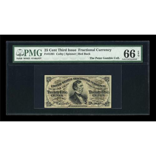 <B>Fr. 1291 25¢ Third Issue PMG Gem Uncirculated 66 EPQ.</B></I> This red back Fessenden has earned not only the high 66 grade, but also the "Exceptional Paper Quality" designation.<BR><I>From The Peter Gamble Collection.</B></I><BR><BR><b>Shipping:</b> Coins & Currency (<a target="_blank" href="http://www.heritageauctions.com/common/shipping.php">view shipping information</a>)