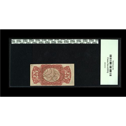 <B>Fr. 1291 25c Third Issue PCGS Choice New 63PPQ.</B></I> Tight at the left and bottom, but beautifully bright, and a partial plate number "2" is noticed in the lower left corner.