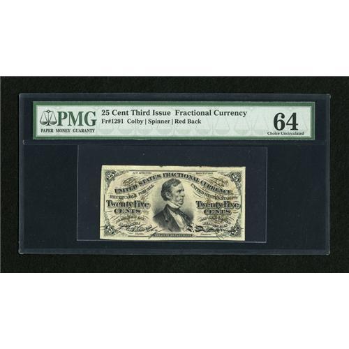 <B>Fr. 1291 25c Third Issue PMG Choice Uncirculated 64.</B></I> This is a well margined Red Back Fessenden which is difficult to locate at this grade level.<BR><BR><b>Shipping:</b> Coins & Currency (<a target="_blank" href="http://www.heritageauctions.com/common/shipping.php">view shipping information</a>)