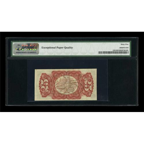 <B>Fr. 1291 25c Third Issue PMG Gem Uncirculated 65 EPQ.</B></I> Partial face plate number 72 is visible at upper left on this superior example with behemoth margins. It is well centered with excellent color and deep inks.<BR><BR><b>Shipping:</b> Coins & Currency (<a target="_blank" href="http://www.heritageauctions.com/common/shipping.php">view shipping information</a>)