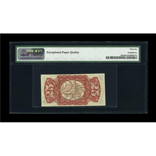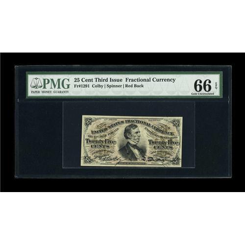 <B>Fr. 1291 25c Third Issue PMG Gem Uncirculated 66 EPQ.</B></I> This note is very similar to one that appeared in our FUN sale earlier this year. It is a stunning Red Back Fessenden with cavernous original embossing, and perfect paper and flashy ink color.<BR><BR><b>Shipping:</b> Coins & Currency (<a target="_blank" href="http://www.heritageauctions.com/common/shipping.php">view shipping information</a>)