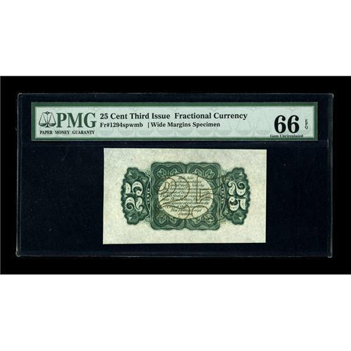 <B>Fr. 1291/94SP 25¢ Third Issue Wide Margin Set of Three PMG Gem Uncirculated 66 EPQ/66 EPQ/65 EPQ.</B></I> All three pieces of this Wide Margin Fessenden Set have earned the PMG EPQ designation. The Face and Green Back are both graded 66, and the Red Back is just a hair behind them at 65. A beautiful set, well worth a very strong bid<BR><BR><b>Shipping:</b> Coins & Currency (<a target="_blank" href="http://www.heritageauctions.com/common/shipping.php">view shipping information</a>)