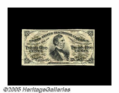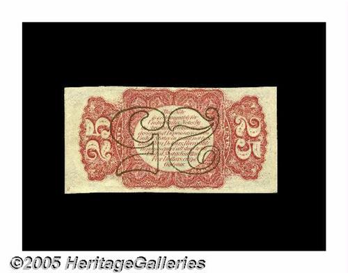 <B>Fr. 1291 Milton 3R25.1h 25¢ Third Issue Inverted Back Surcharge Very Choice New.</B></I> Only two types of red back inverts are known. This Fessenden and the Fr. 1357 Justice. That Justice invert is relatively common with about a dozen pieces known, but this Fessenden remains, to our knowledge, totally unique. Milt had seven green back Fessenden inverts, but in over thirty years of searching, was never about to locate a red back. This note has grade as well as rarity in its corner. The piece is nicely margined, beautifully bright and has retained all its original embossing. It also boasts a partial face plate number (74?) and the full back plate number 2. One of the most significant inverts in this or any other sale.