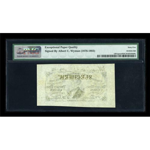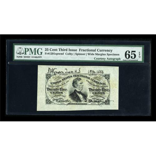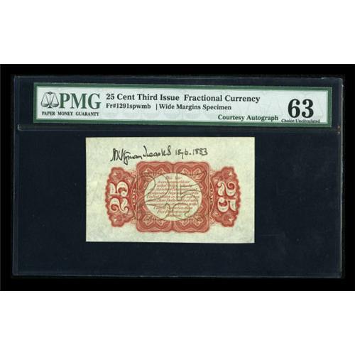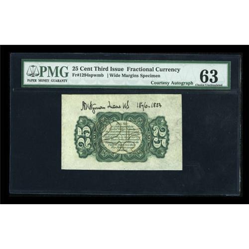 <B>Fr. 1291SP 25c Third Issue Wide Margin Courtesy Autographed Set of Three.</B></I> All three notes have been signed "A.U. Wyman Treas US 1876-1883". The signatures were clearly all done at the same time. PMG has graded the Face <B>65 EPQ,</B></I> and both the Red and Green Backs have been graded as <B>PMG</B></I> <B>63</B></I>. Wyman is a less common courtesy-autographed signature, and it is particularly scarce on Wide Margin specimens.<BR><BR><b>Shipping:</b> Coins & Currency (<a target="_blank" href="http://www.heritageauctions.com/common/shipping.php">view shipping information</a>)